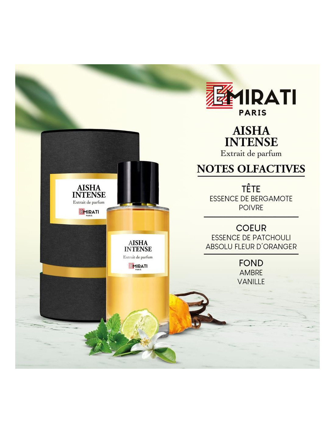 Aïcha Intense est une fragrance envoûtante et énergique, créée pour la femme audacieuse et passionnée. Ce parfum s'ouvre sur des notes florales de fleur d'oranger 🌼 et de rose 🌹, qui apportent une touche délicate et raffinée. Au cœur, une alliance profonde de patchouli 🌿 et de safran 🌟, qui confère à cette fragrance une intensité unique et un caractère affirmé. Le tout est enveloppé dans un fond chaleureux de musc 🐾 et de bois de santal 🌳, offrant une sensation de longévité et de profondeur.