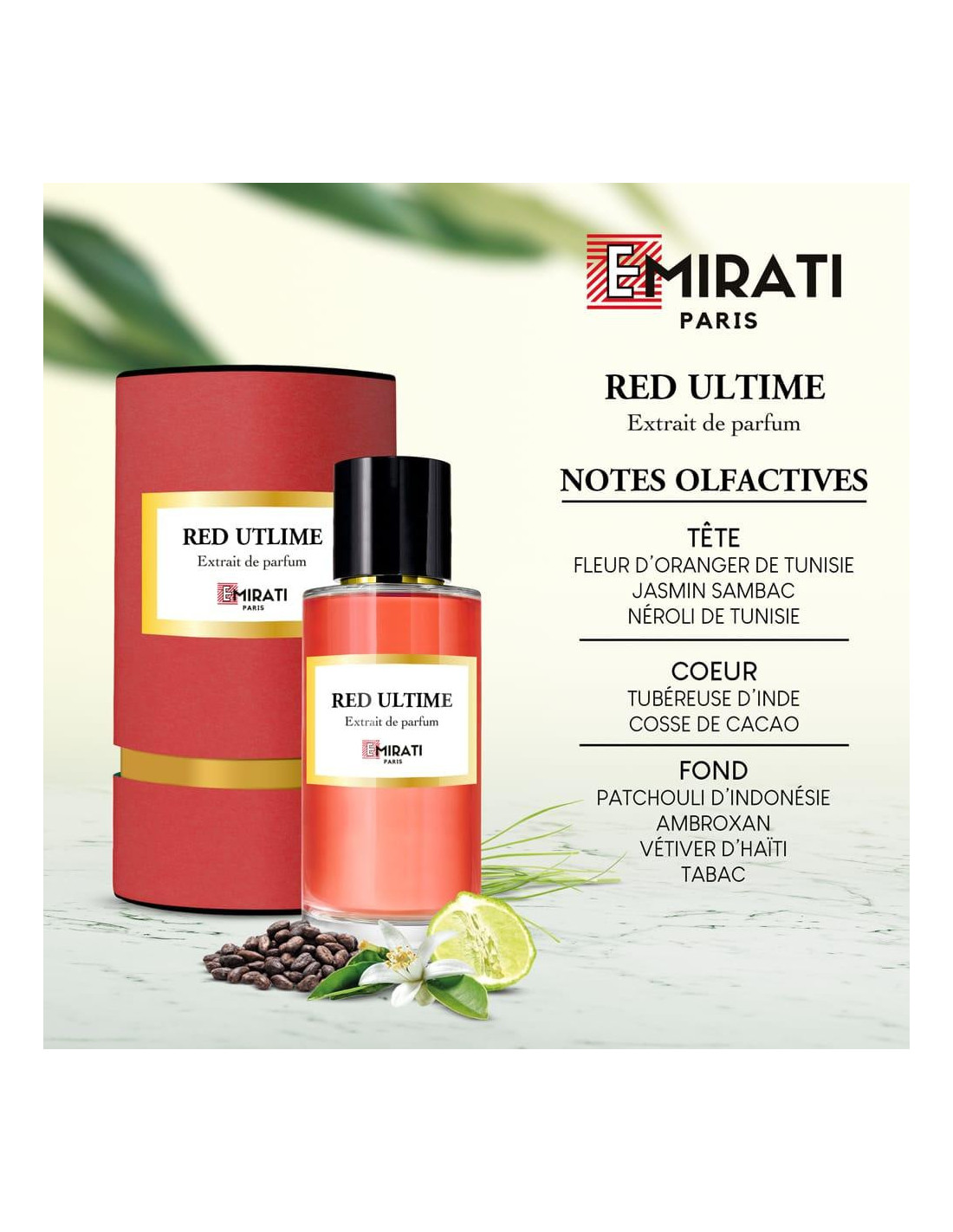Red Ultime est un parfum intense et audacieux, une fusion parfaite de passion et de sophistication. Il s'ouvre sur des notes fruitées , qui captivent instantanément les sens. Le cœur exotique de la tubéreuse d'Inde, sublimée par la chaleur gourmande du cacao, créant une sensation de luxe et de sensualité. En fond, des notes boisées et musquées 🐾🌳 apportent de la profondeur et de la longévité, laissant une empreinte inoubliable sur la peau.