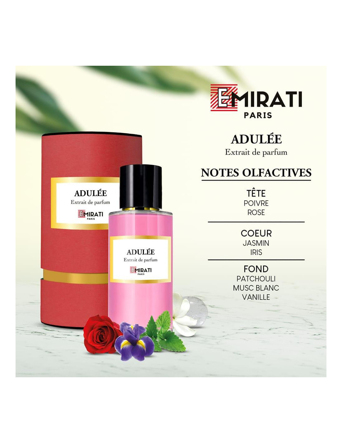 Adulée est une fragrance envoûtante et pleine de grâce, une véritable ode à la féminité. Ce parfum allie la douceur florale du jasmin 🌺 et de la rose 🌹, créant une première impression de légèreté et de raffinement. En cœur, le patchouli 🌿 ajoute une profondeur mystérieuse, tandis que le musc 🐾 et la vanille 🍦 en fond apportent une touche sensuelle et douce, enveloppant la peau d'une chaleur irrésistible. Un parfum complexe, élégant et séduisant, idéal pour la femme qui souhaite marquer les esprits. ✨
